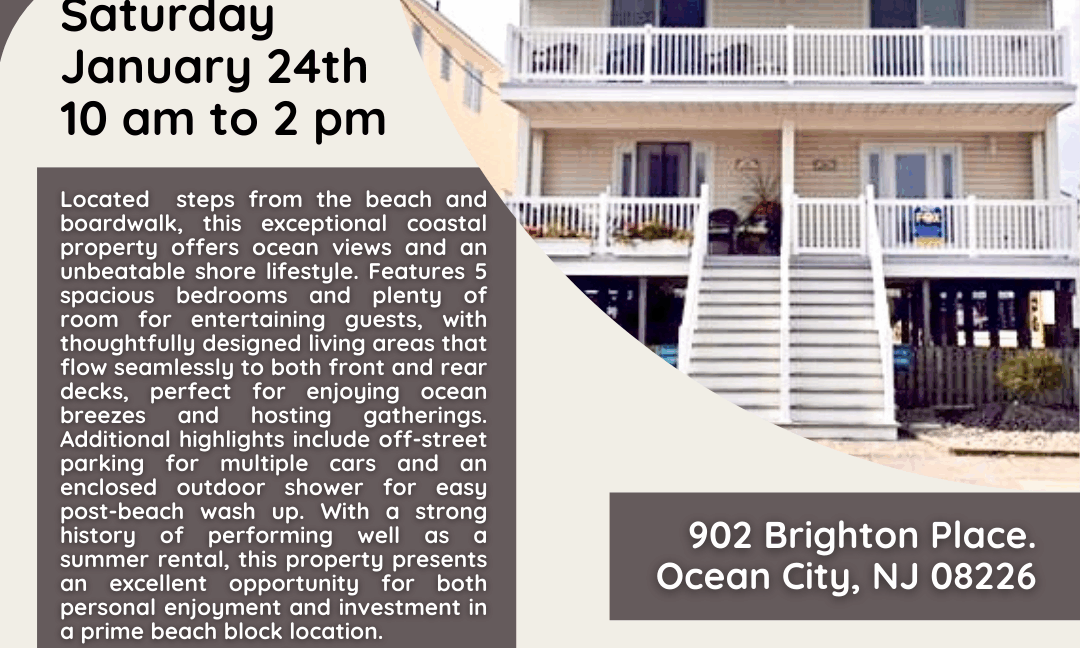 OPEN HOUSE SATURDAY! Saturday, January 24th from 10am to 2pm at 902 Brighton Place in Ocean City. This beach block 5 bedroom home is just a few steps to the beach and boasts front and rear decks, off-street parking, and an enclosed outdoor shower. Stop by to visit this Saturday for details and a tour…