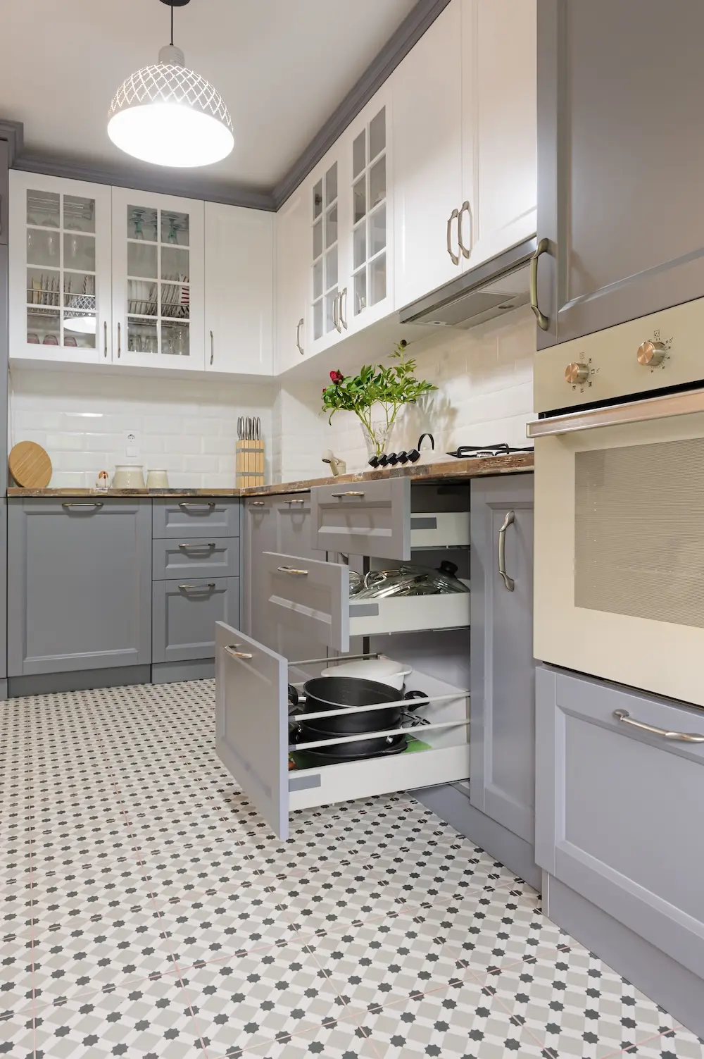 More homeowners also are contrasting their kitchen cabinets in following the two-tone trend—choosing one shade for the upper cabinets and one for the lower.