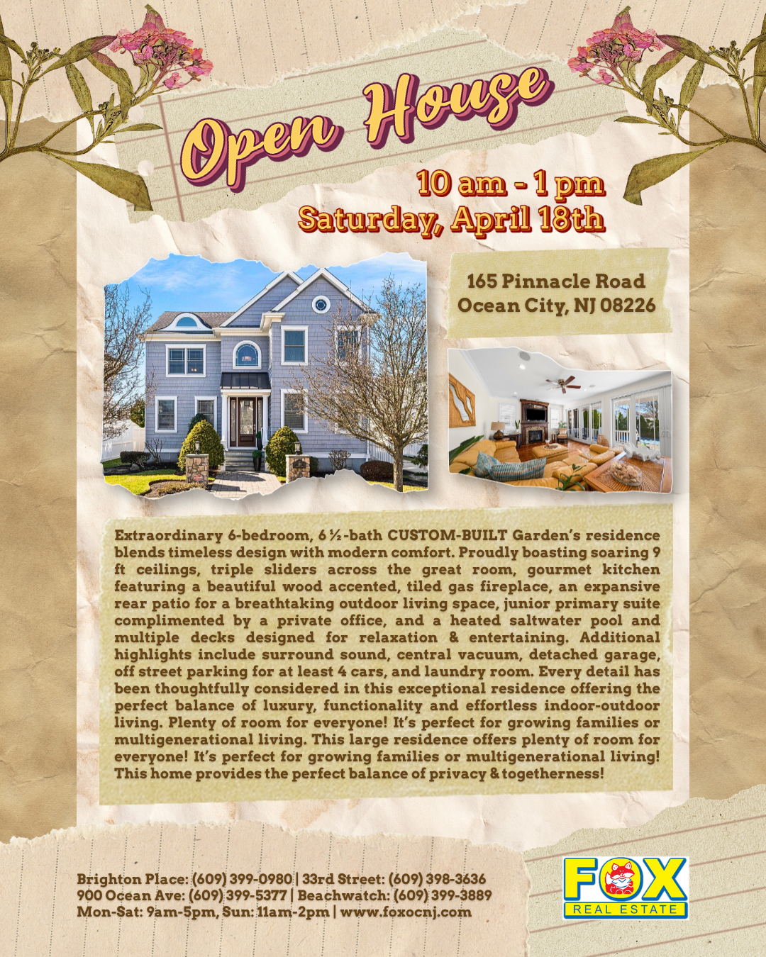 OPEN HOUSE! Saturday, April 18th from 10am to 1pm at 165 Pinnacle Road, Ocean City, NJ. Breathtaking, custom-built single-family home, nestled in the prestigious Gardens community. 6 bedrooms, 6½ bathrooms, stunning great room complete with wood accented, tiled gas fireplace, and a private resort-style outdoor area, featuring a heated saltwater pool and multiple decks. A must see! Stop by this Saturday and visit with us for in-depth details and a walk through of this stunning home.